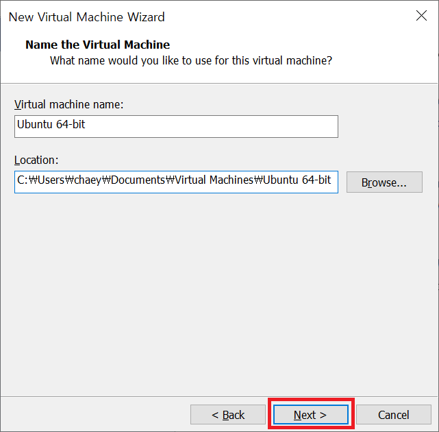 4. VM으로 설치될 운영체제의 이름과 경로를 설정하세요.